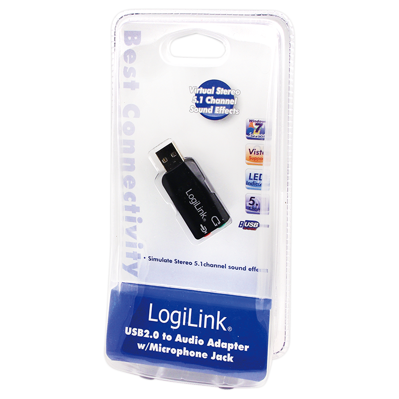 The LogiLink USB sound card provides an easy way to connect speaker, microphone, headset or IP phone with your PC. It is connected with the USB port of your computer as needed and supports Plug and Play. Using the integrated 3D sound effects the adapter can simulate a surround sound. The status of the connected devices can be monitored via the LED indicator lights.