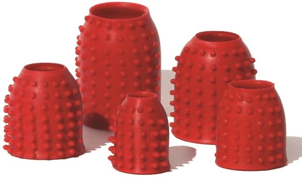 Fleksibelt rød gummi med dupper og åbning i toppen så der kommer luft til fingeren under brug.