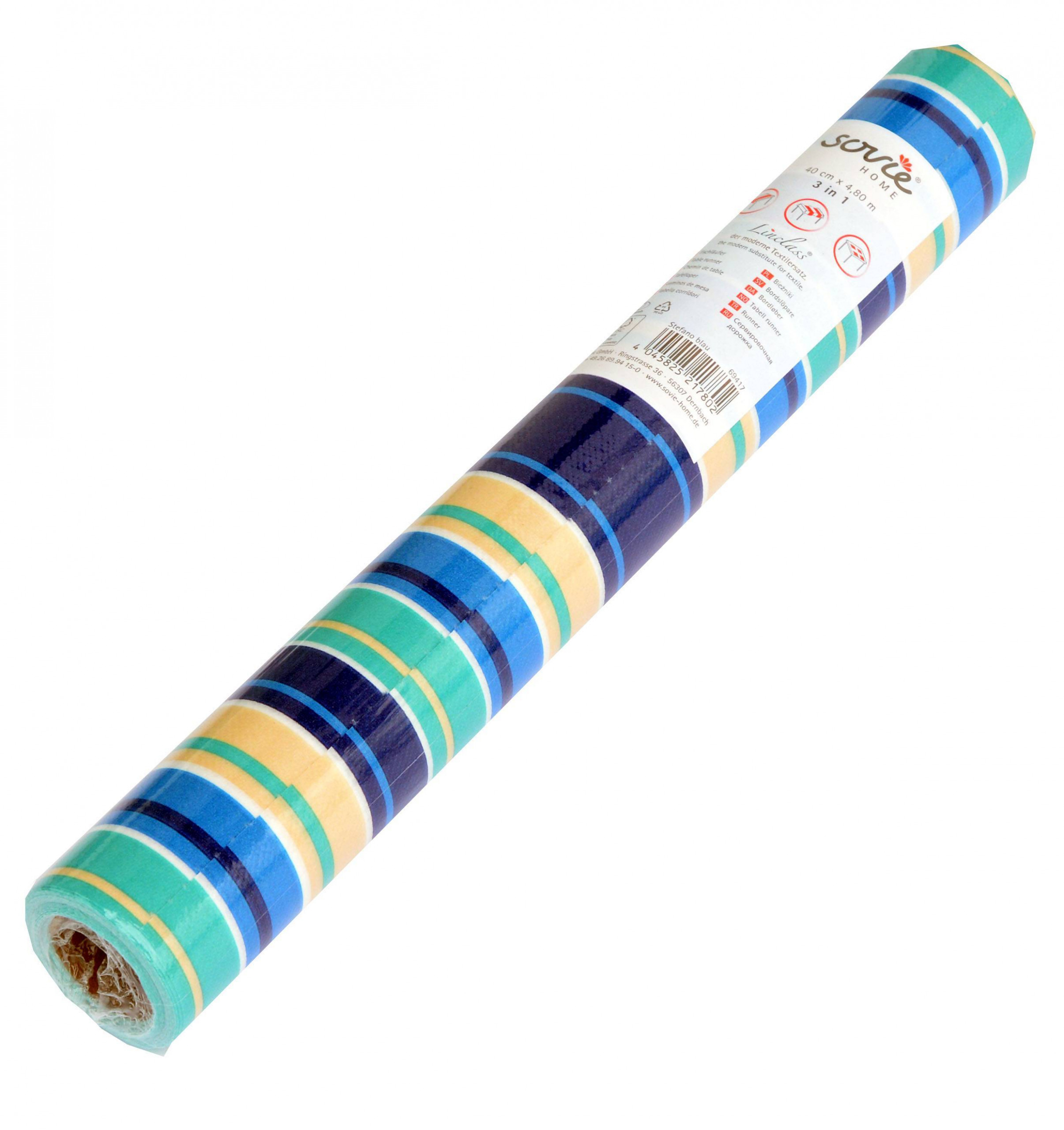 Bordløber i tekstil med blå striber, mange friske farver. Mål: Bredde: 40 cm. Længde: 4,80 mtr.