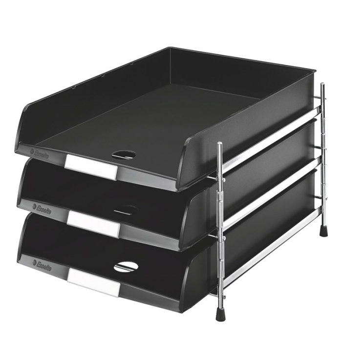 Klassisk Esselte brevbakkesæt C4 med 3 bakker i krom. Stabilt metalstativ, modulopbygget design og nem adgang til dokumenter.