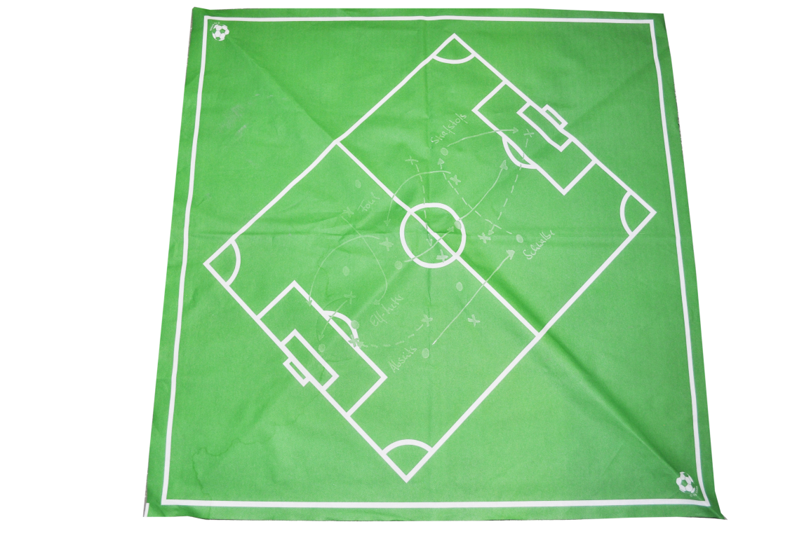 Flot dug i kraftig tekstil, flot dekoreret som fodboldbane, velegnet som alterntiv bordløber og lign. Mål: 80×80 cm.