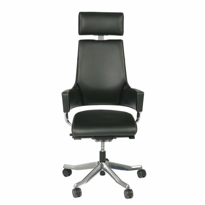 Den elegante og stilfulde chefstol Delphi i ægte sort læder, har et pænt design hele vejen rundt. Der er tilmed læder på ryglænets bagside. Denne stol kunne være en oplagt mulighed, hvis der ønskes en smuk stol på kontoret eller hjemme i stuen. Populær chefstol Samtidig med et elegant design er der lagt vægt på en behagelig siddekomfort. Ryggen og armlænene virker omsluttende og imødekommende for brugeren. Stolen er lavet i ægte sort læder med en fin cremefarvet syning langs kanten, som fremhæver stolens detaljer. Delphi har i mange året været en populær kontorstol. Stolen er med høj ryg, faste armlæn og stel i børstet aluminium samt højdejusterbar nakkestøtte. Synkron vippefunktion som gør at sæde og ryg følger hinanden. Dette vip kan justeres efter vægt og kan låses i flere positioner. Sædepolstring af polyurethane-skum som holder formen i mange år. Dobbeltlaget skum på ryglæn, armlæn og nakkestøtte for ekstra komfort. Chefstol Delphi er med følgende funktioner: Justerbar nakkestøtte så støtten kan tilpasses dit baghoved. Synkronmekanisme som vipper sæde og ryg sammen i et ergonomisk godt forhold. Armlæn som sikrer støtte bl.a. når du arbejder med computermus. Specifikationer: Stoftype: Ægte læder Siddehøjde: 42-51 cm. Rygtype: Høj Nakkestøtte: Inklusiv. Højdejusterbar Armlæn: Inklusive Total bredde: 70 cm. Total højde: 119/132,5 cm. Armlæns højde over sædet: 22 cm. Max belastning: 120 kg.
