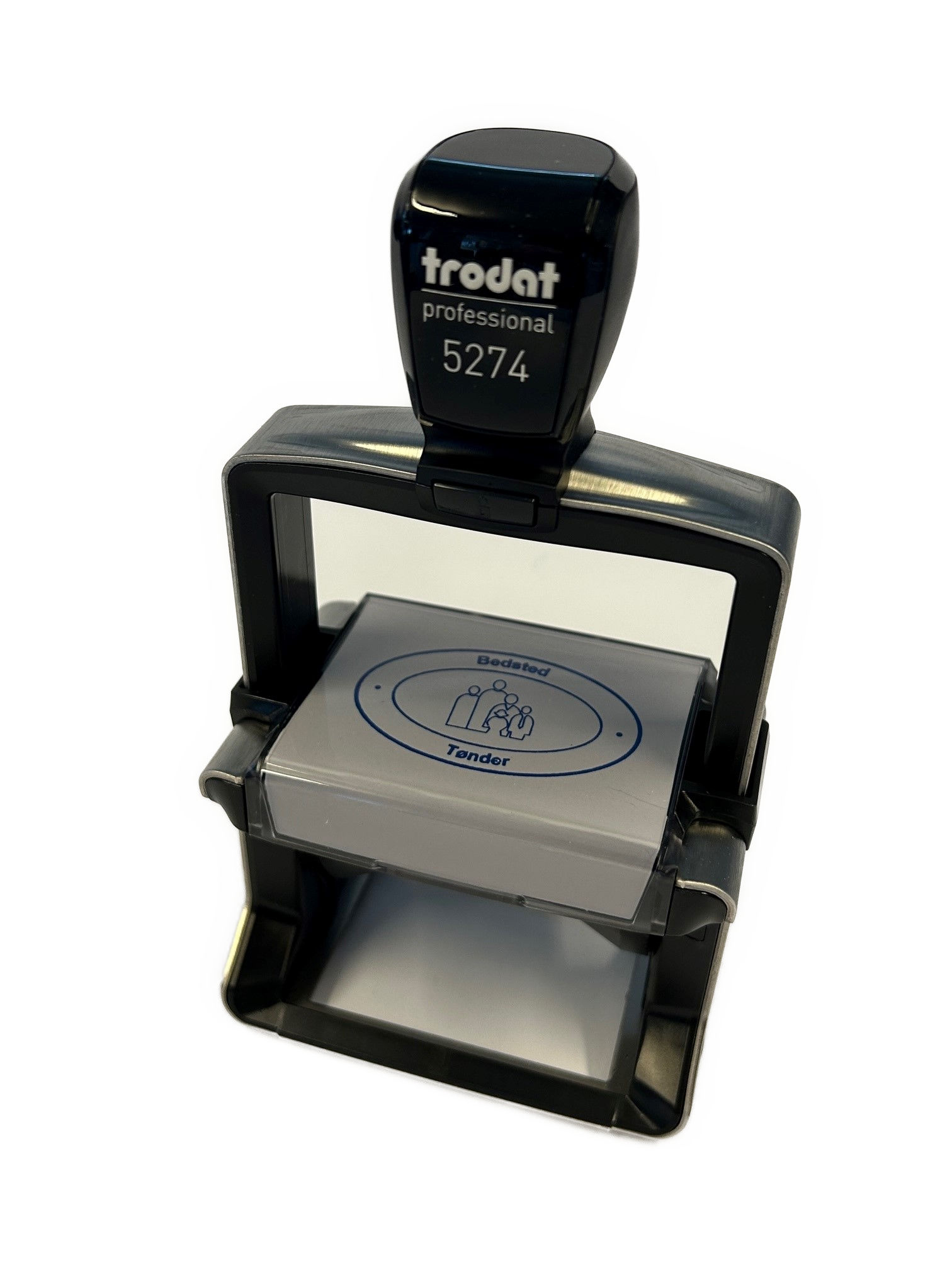 Religionsneutralt stempel m/logo 36×56,4 mm. Trodat 5207/5274 m/blå farvepude