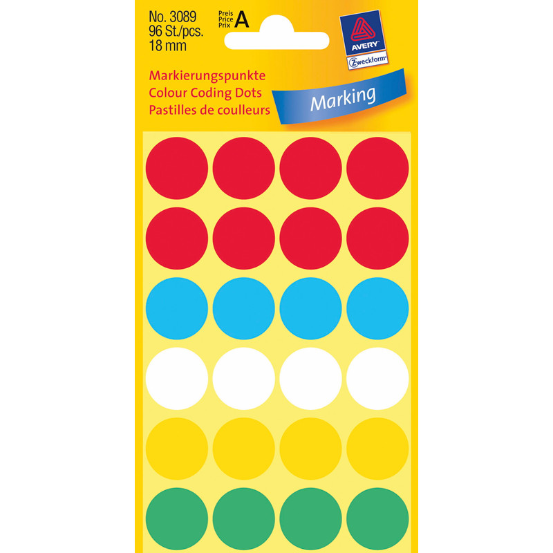 Etiketter Avery 3089 Ø18 mm. 96 stk. ass. farver