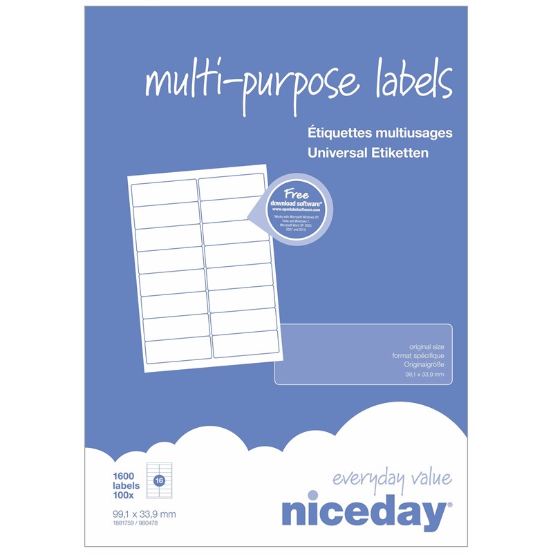 Niceday universal etiketter er velegnede til alle former for print og kopi. Leveres i pakker med 100 ark.