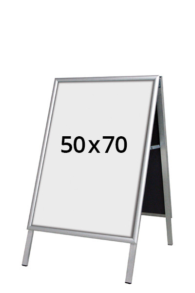 Gadeskilt med 25 mm. alu snap frame, eloxeret aluprofil med geringshjørner. Bagplader i PS. Ben i 15 x 30 mm alu-firkantrør. Refleksfri APET frontplader. Skiltet ruster ikke, men anbefales til indendørs brug. Mål: 53 x 95 x 68 cm.