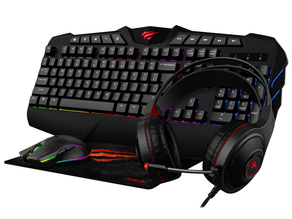 Gamersæt bestående af tastatur, mus, musemåtte, og headset