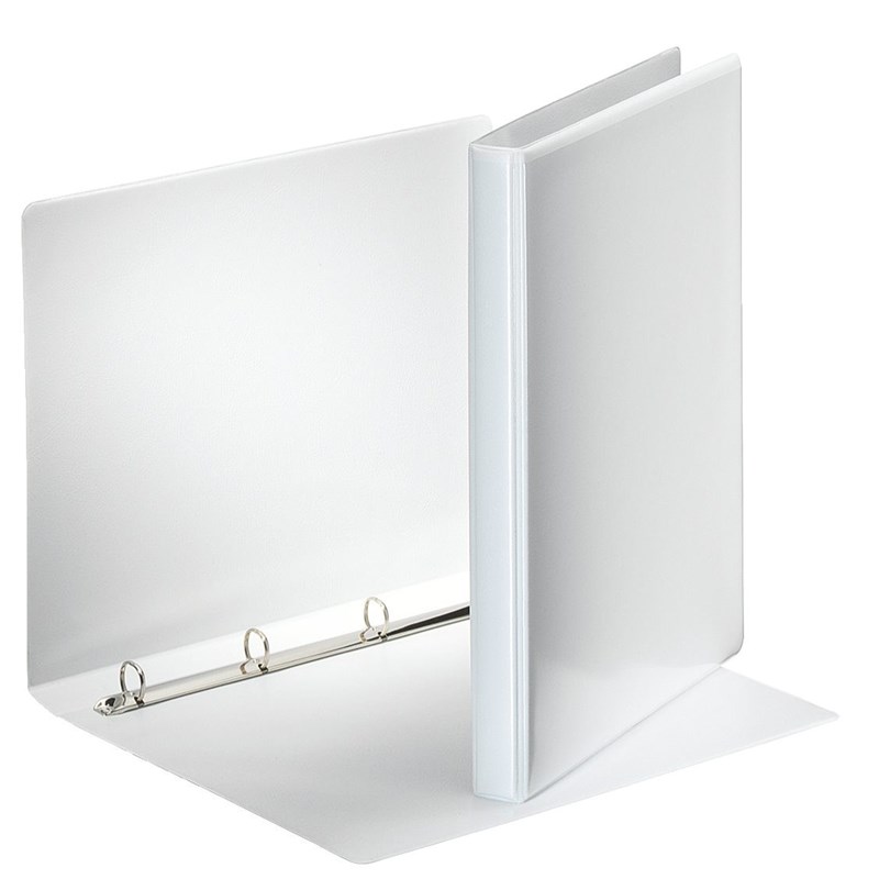 Hvidt Esselte indstiksringbind med transparent lomme på forside og ryg. Ideelt til præsentationer, salgsmapper og manualer.
