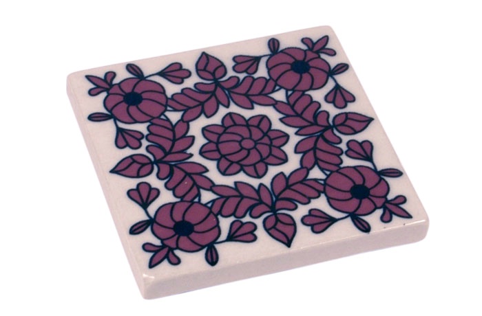Lille kakkel med mønster i lilla farver, velegnet som bordskåner og lign. Mål:  10 x 10 cm.