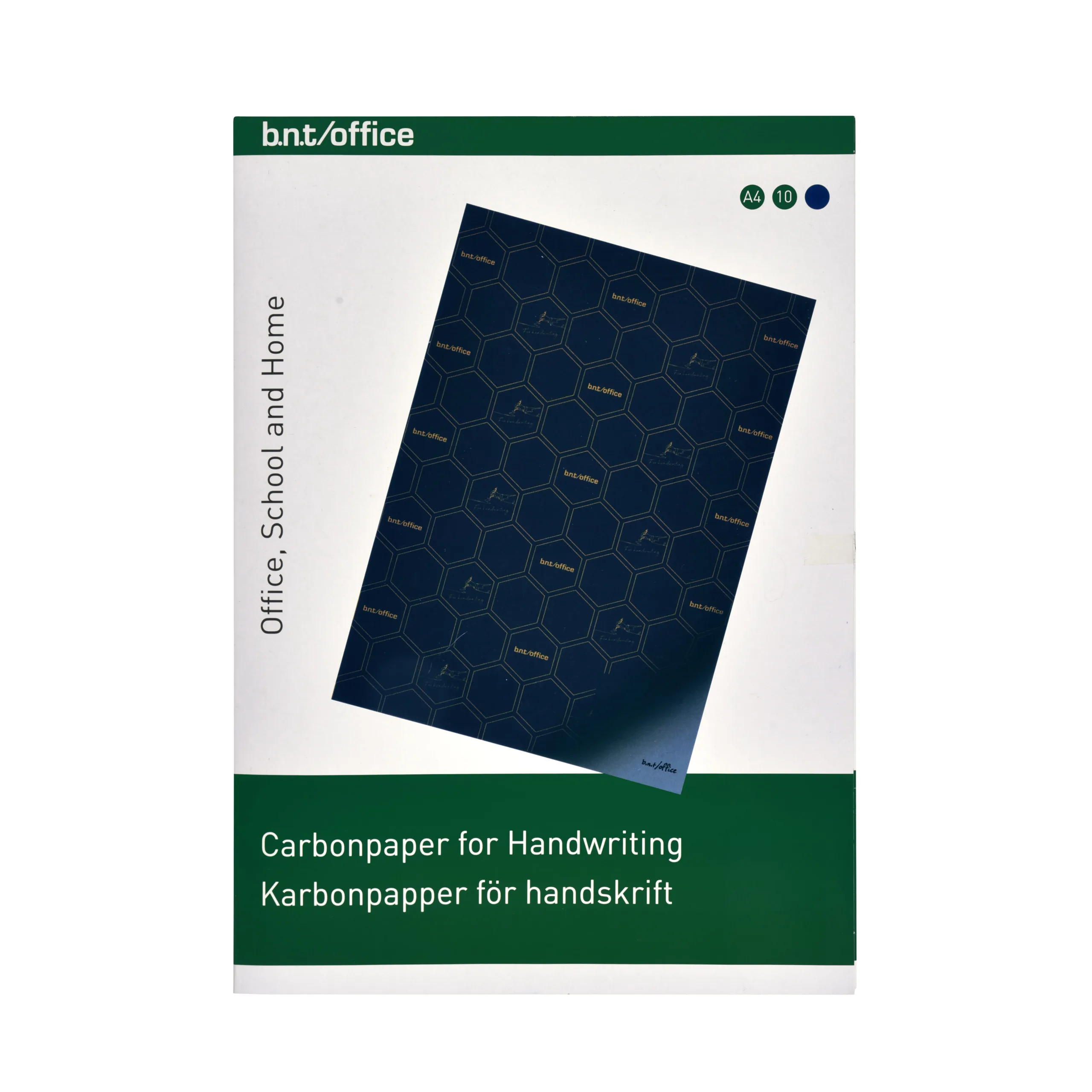 Blåt gennemslags karbonpapir til håndskrift. Carbonpapir er et tyndt kalkerpapir, der bruges til at lave kopier. Det har en vokset bagside og giver et tydelig resultat. Det samme karbonpapir kan bruges flere gange. Denne variant er designet til håndskrift, men kan også bruges til skrivemaskiner. Hver pakke indeholder 10 ark i A4.