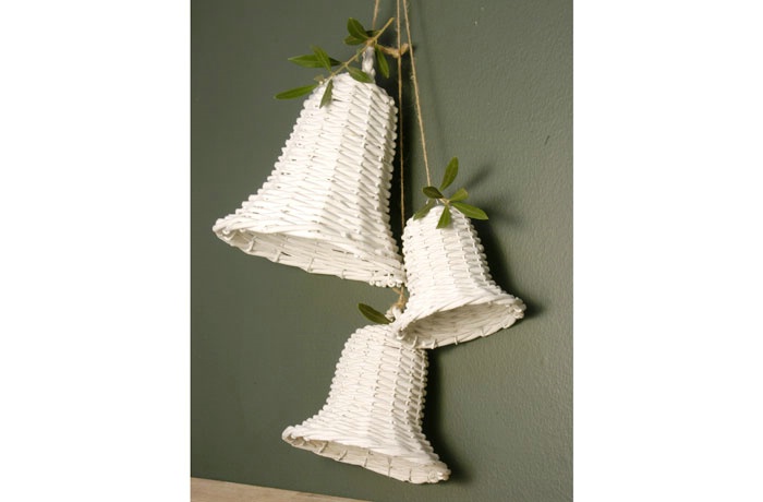 Flot hvid klokke i flettet pil. Mål: Ø: 11,5 cm. Højde: 13 cm.