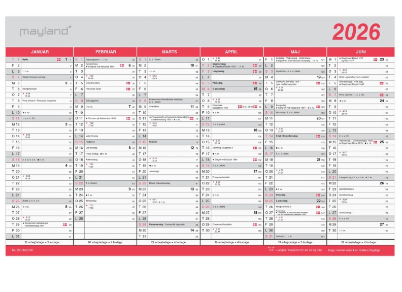Mayland vendbar flagkalender i FSC®-certificeret karton. Viser seks måneder ad gangen i overskueligt tværformat. Kalenderen indeholder officielle flagdage, antal arbejdsdage, månefaser samt solens op- og nedgangstider. Praktisk vendbar kalender med to sider – ét halvår pr. side. Ideel til både hjem, kontor og institutioner.