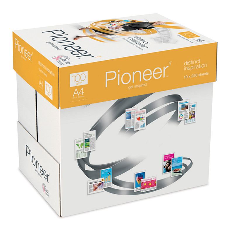 Pioneer er et premium kontorpapir. Kvaliteten er markedets hvideste kvalitet og indholdet af eukalyptus giver en god stivhed, bulk og opacitet. Hvidheden og den jævne overflade giver gode trykresultater i både sort/hvid og farver. Pioneer er velegnet til både laser-og inkjet tryk såvel som offset og digitaltryk. Pioneer er egnet til præsentationer, dokumenter og brevpapir hvor der blandes sort/hvid og farvetryk.