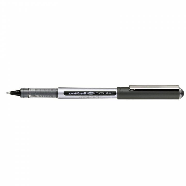Uniball UB150 med specielt blækledersystem, som sikrer en jævn blæktilførsel. Vandbaseret pigmentblæk.
