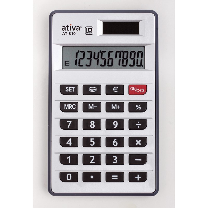 Lommeregner Ativa AT-710, 10 cifre, Dualpower 3 memory taster, %tast, fortegns vender. Robust metaloverflade og kraftig bagbeklædning i plast. Batteri: 2 x LR54.