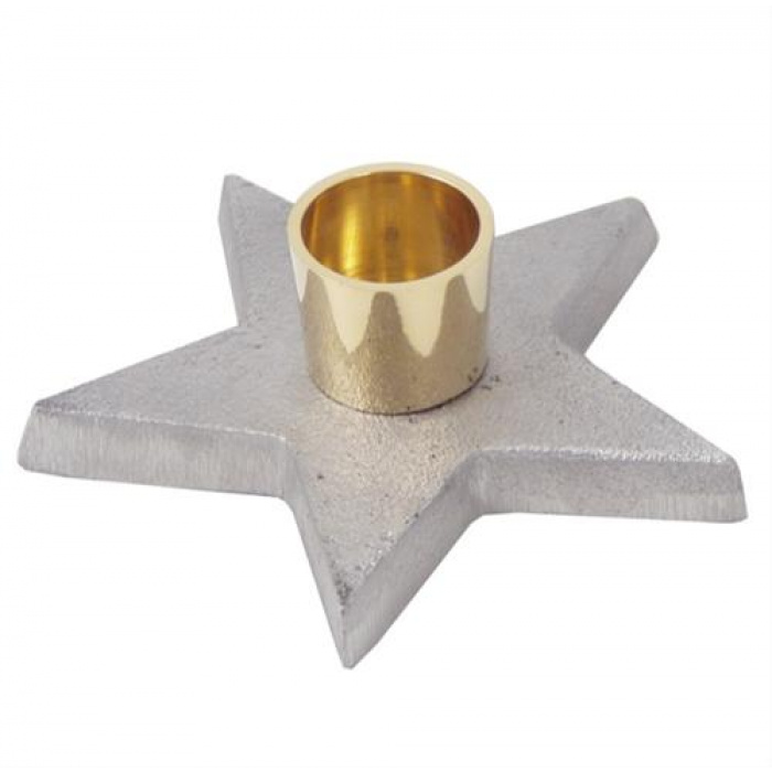 Lysestage i blankpoleret messing på stjernefod i sølvfarvet støbejernsfod.