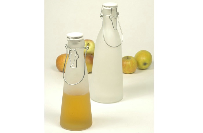 Mælkeflaske med hvidt patentlåg i frostet glas. Mål: Ø:10 cm. Højde: 29 cm.