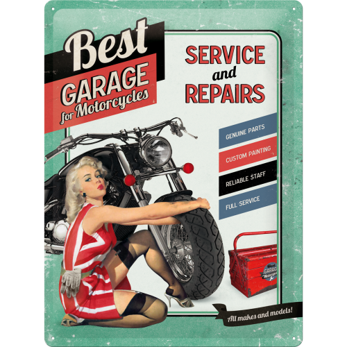 Metalskilt “Best Garage for Motorcycles” med huller til vægophæng i A3-format. Mål: 30×40 cm.