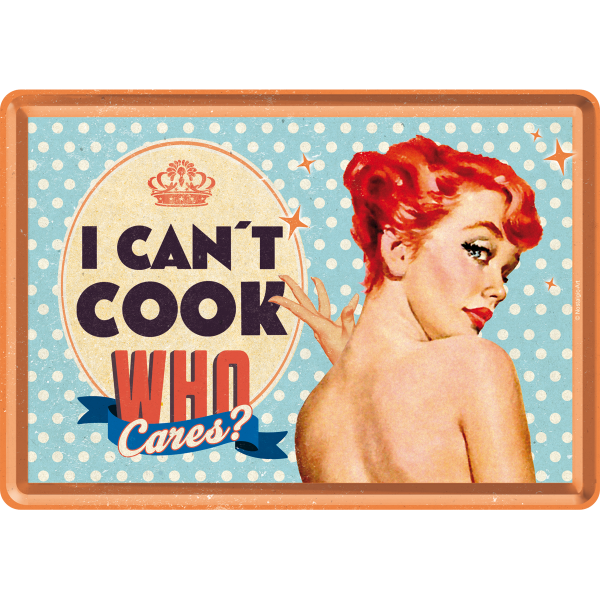 Metalskilt “Can´t cook, who cares?” 10×14 cm.