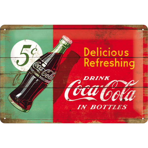 Metalskilt i Coca-Cola serien “Coca-Cola – Delicious Refreshing” Retro reklameskilt med huller til vægophæng i A4-format. Mål: 20×30 cm.