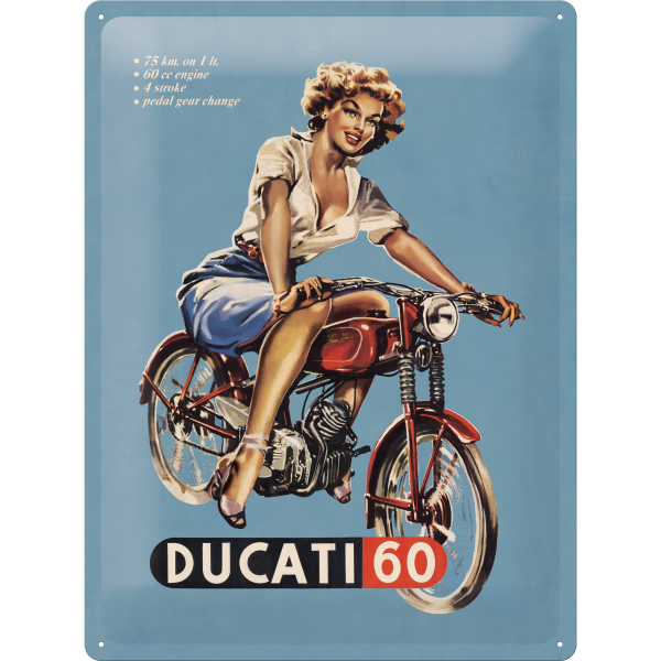 Metalskilt “Ducati 60 – Pin Up girl” med huller til vægophæng i A3-format. Mål: 30×40 cm.