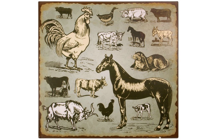 Stort metalskilt med dyremotiver. Mål: Længde: 30,5 cm. Højde: 30,5 cm.