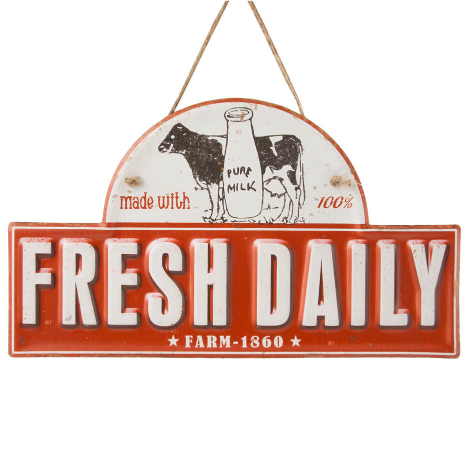 Flot metalskilt med motiv/tekst præget i pladen så skiltet fremstår med tredimensionelle effekter. Ophænges let med medfølgende hørsnor. Mål: Bredde: 30 cm. Højde: 27 cm.