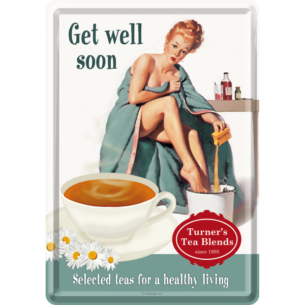 Metalskilt/Postkort “Get well soon – Turner´s Tea Blends since 1895 – Selected teas for a healty living”” Mål: 10×14 cm. Incl. hvid kuvert.