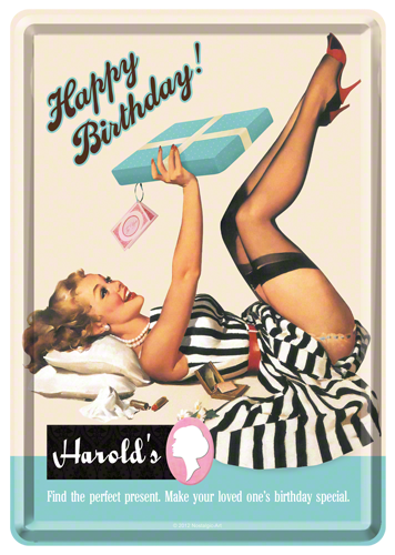 Metalskilt/Postkort “Happy Birthday Harrold´s” Mål: 10×14 cm. Incl. hvid kuvert.
