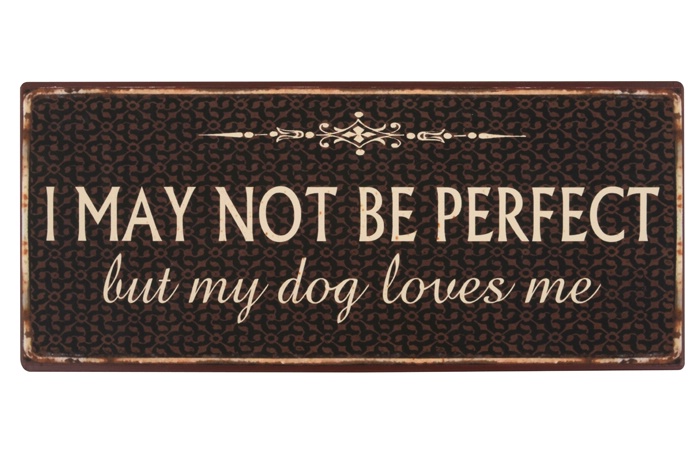 Metalskilt “I MAY NOT BE PERFECT but my dog loves me” Mål: Længde: 30 cm. Højde: 13 cm.