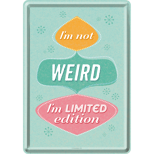 Metalskilt/Postkort “I’m not Weird – I’m Limited edition” Mål: 10×14 cm. Incl. hvid kuvert.