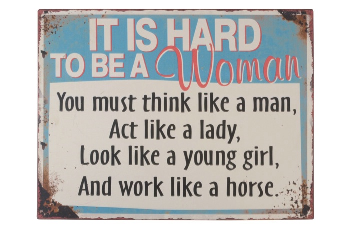 Metalskilt fra Ib Laursen med teksten “It is hard to be a woman…” Mål: Længde: 35 cm. Højde: 26 cm.