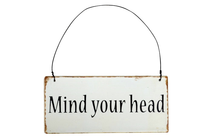 Metalskilt-/Hængemærke “Mind your head” med ståltråd til ophæng.