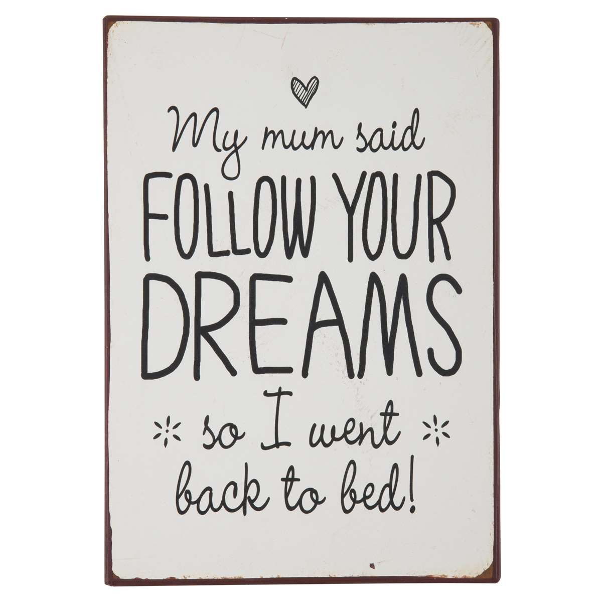 Metalskilt “My mum said FOLLOW YOUR DREAMS so I went back to bed!” Mål: Længde: 14 cm. Højde: 20 cm.