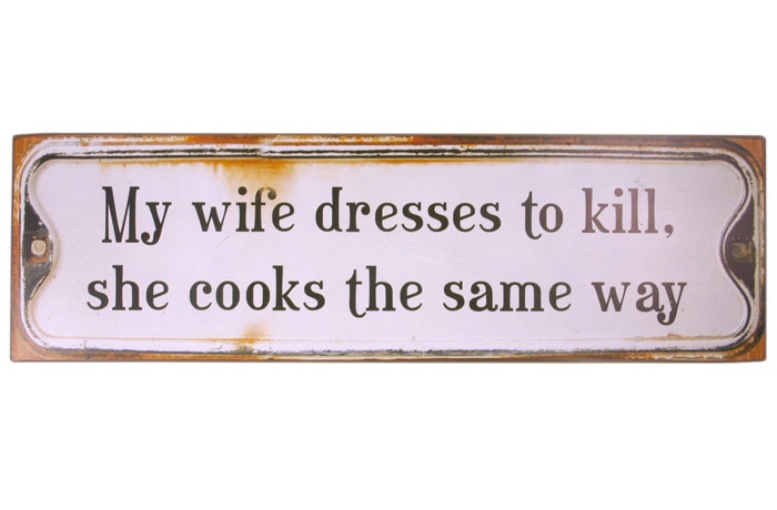 Metalskilt “My wife dresses to kill she cooks the same way”