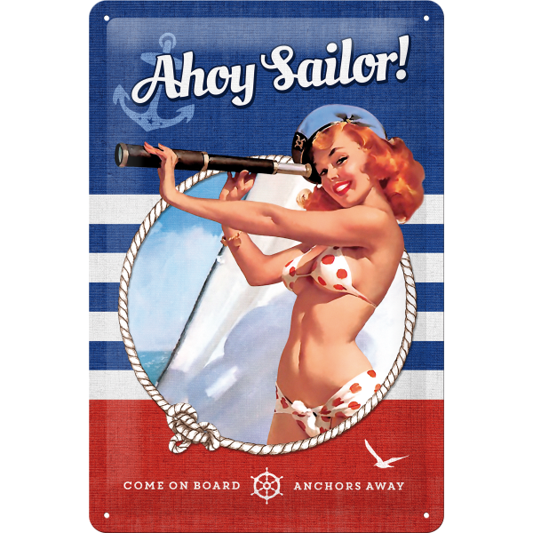 Metalskilt i “Ahoy Sailor! Pin-Up Girl” med huller til vægophæng i A4-format. Mål: 20×30 cm.