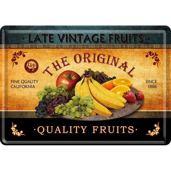 Metalskilt/Postkort “Late Vintage Fruits – The Original – Quality Fruits”” Mål: 10×14 cm. Incl. hvid kuvert.