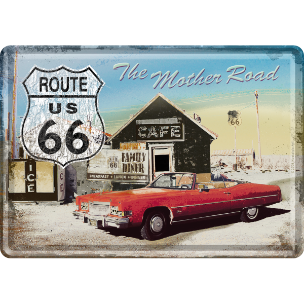 Metalskilt/Postkort “Route 66 – The Mother Road”” Mål: 10×14 cm. Incl. hvid kuvert.
