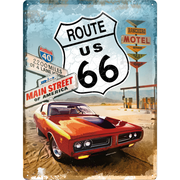 Metalskilt “Route US 66 – Main Street of America” med huller til vægophæng i A3-format. Mål: 30×40 cm.