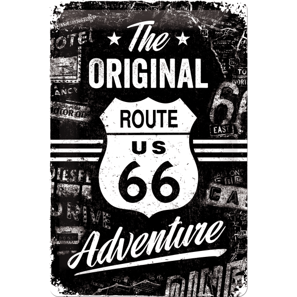Metalskilt i “The Original Route US 66 – Adventure” med huller til vægophæng i A4-format. Mål: 20×30 cm.