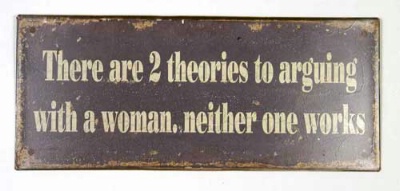 Metalskilt “There are 2 theories to arguing with a woman . neither one works” B: 30,5 cm. H: 13 cm.
