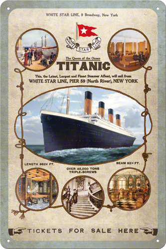 Metalskilt “Titanic” med huller til vægophæng i A4-format. Mål: 20×30 cm.