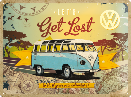 Metalskilt “VW Bulli – Let gets Lost” med huller til vægophæng i A3-format. Mål: 30×40 cm.