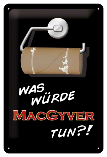 Metalskilt “Was wurde McGyver tun?” med huller til vægophæng i A4-format. Mål: 20×30 cm.