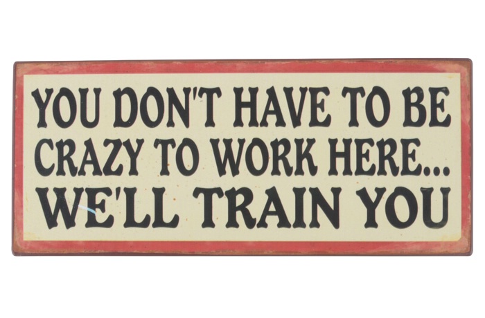 Metalskilt fra Ib Laursen “You dont have to be crazy to work here… WE´LL TRAIN YOU”