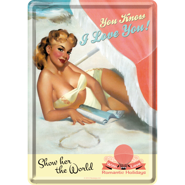 Metalskilt/Postkort “You know I love you” “Show her the world” “Romantic Holydays”” Mål: 10×14 cm. Incl. hvid kuvert.