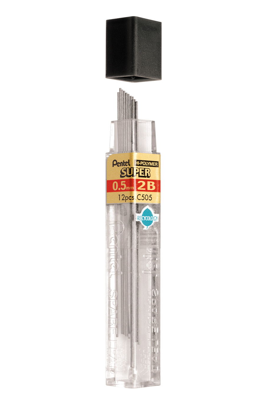 Pentel Hi-Polymer stifter til stiftblyant i 0,5 mm og hårdhed 2B. Ekstra glatte og stærke stifter med høj grafitandel. Etuiet indeholder 12 stifter og er fremstillet af 98 % genanvendt plast.