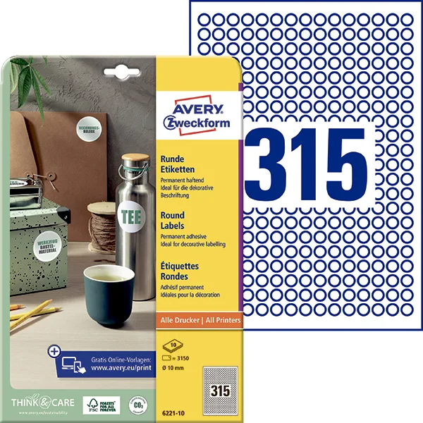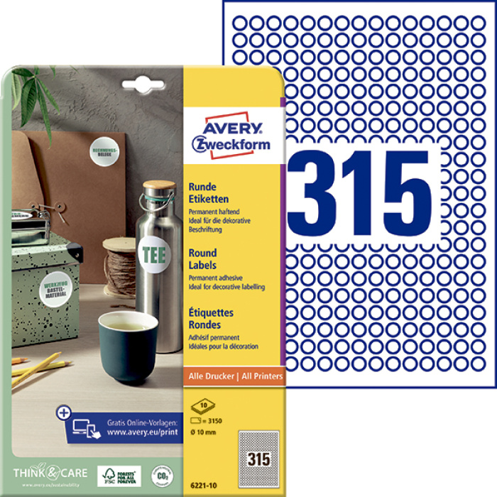 Multilabels Avery 6221, Ø10 mm. 10 ark. Hvid