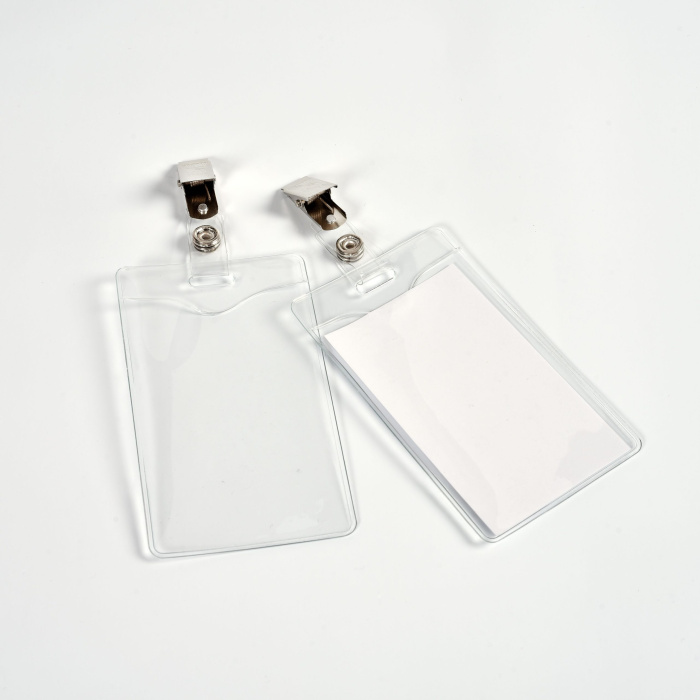 Navneskilte i blød plast med metalklemme og åben top til fx. ID-kort etc.