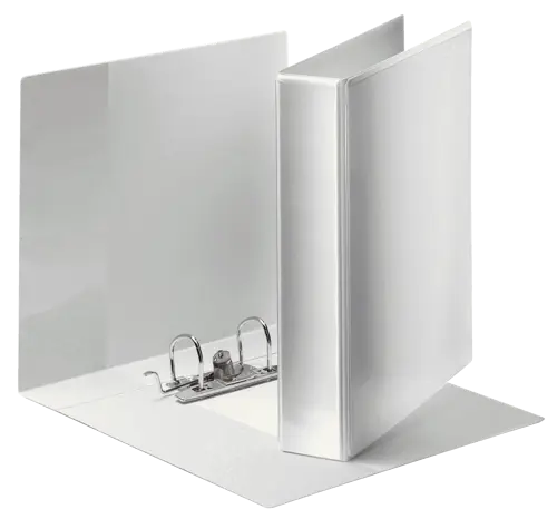 Panoramabind Esselte Maxi A4 i hvid med 2D ringmekanisme (50 mm) og 3 transparente udvendige lommer. Rummer op til 350 ark og har indvendig lomme – ideel til præsentation, tilbud og arkivering.